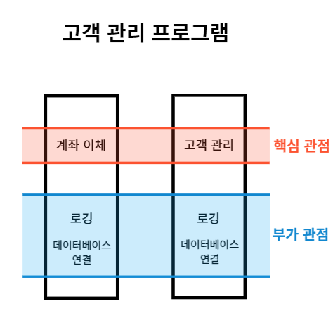 위 그림으로 예를 들어보자면, 핵심 관점은 계좌이체/고객관리 로직이고, 부가 관점은 로깅/데이터베이스 연결 로직이다.