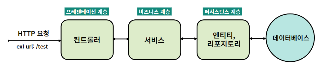 계층이라는 것은 각자의 역할과 책임이 있는 소프트웨어의 구성 요소를 의미합니다. 각 계층은 특정한 역할과 책임을 가지며 서로 분리되어 작동하도록 설계되어 있습니다. 스프링부트에는 프레젠테이션, 비즈니스, 퍼시스턴스 계층이 있습니다. 이 계층은 서로 통신하며 프로그램을 구성합니다. 스프링부트의 각계층은 서로 소통할 수 있지만 다른 계층에 직접 간섭하거나 영향을 미치지 않습니다. 각 계층은 아래 그림과 같이, 양 옆의 계층과 통신하는 구조를 따릅니다.