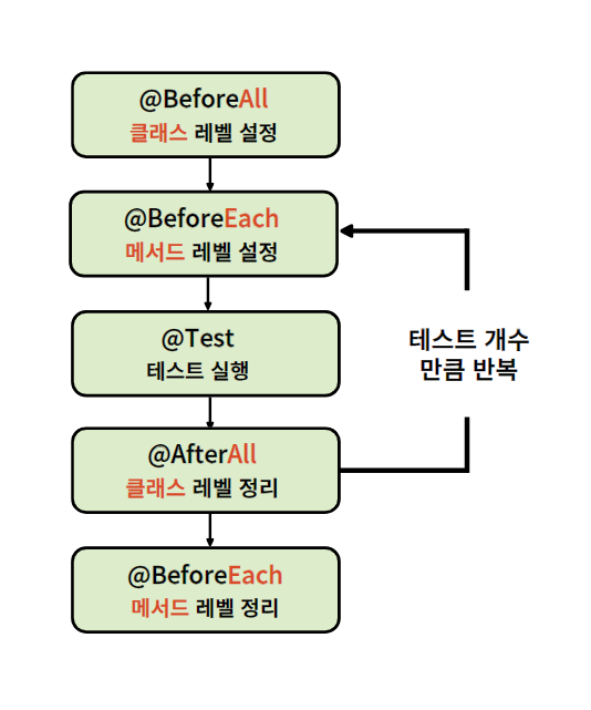 | @BeforeEach | - 실행 : 각 테스트 케이스 시작 전 실행. - 용도 : 객체 초기화 / 테스트에 필요한 값 미리 넣을때 - static : X (각 인스턴스에 대해 메서드를 호출해야하므로 public) |
