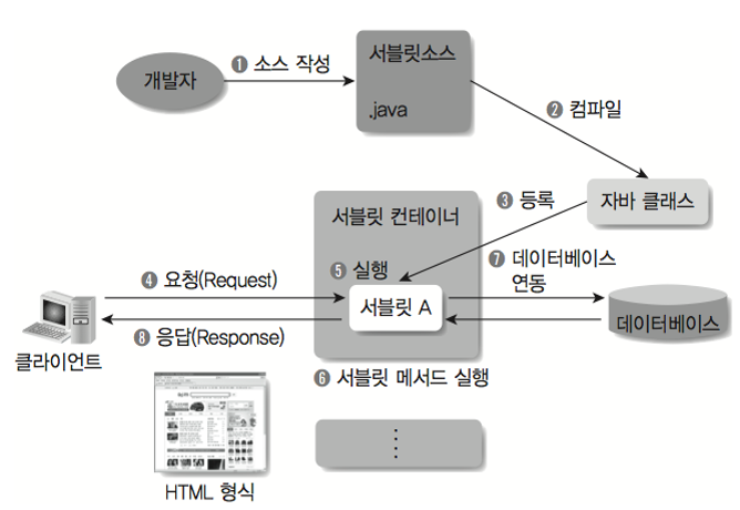 - 서블릿은 WAS가 웹브라우저로부터 요청을 받으면, 해당 요청 수행 후 결과를 웹브라우저에게 전달함.