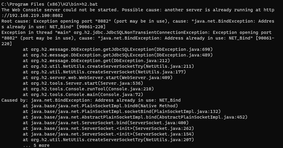 해당 경로의 H2 데이터베이스의 실행 파일인 "h2.bat"을 실행하려고 했으나, 웹 콘솔 서버를 시작할 수 없습니다. 가능한 원인으로는 이미 http://192.168.219.100:8082 주소에서 다른 서버가 실행 중인 것이 있을 수 있습니다. 주요 원인은 "java.net.BindException: Address already in use: NET_Bind" [90061-220] 에러로, 포트 "8082"를 열 때 충돌이 발생한 것입니다.