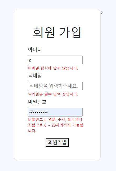 회원가입 시, 사용자가 입력한 데이터가 서버로 전송되기 전에 설정한 규칙에 맞게 입력됐는지,